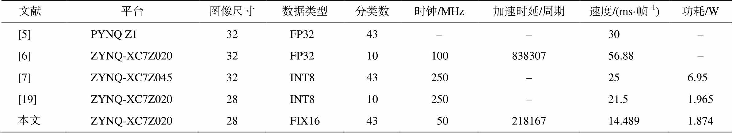 在 PYNQ 框架中, 使用 python 运行32位浮点全精度前向推理, 推理测试集中的 100 张图像, 耗时71s, 平均速度为 710ms/帧, 准确度为 97%。使用FPGA 加速器测试的全部数据集共 12630 张图像, 耗时 183s, 平均速度为 14.489ms/帧, 准确度为85.796%。与在 MCU 上推理相比, 本文设计的异构加速器加速比可达 49。与其他同在 GTSRB 数据集上运行的异构计算性能对比情况见表 3。可以看出, 在图像尺寸方面, 相较于常见的 32×32 像素, 本文选择的 28×28 像素不仅能够减少原始数据的使用量, 还能提高图像分类的有效性。在数据类型方面, 相较于复杂的浮点数运算, 本文采用定点数运算, 无需额外解码资源的占用, 在异构平台上的资源利用率更高, 同时降低数据位宽, 进一步提升数据的利用效率。在维持最大分类数量的前提下, 本文对GTSRB 数据集的全部测试集进行测试, 得到平均测速为 14.489ms/帧。与其他相关研究相比, 本文方法在更低的时钟频率下实现更小的加速时延, 同时减少识别速度, 降低运行功耗。