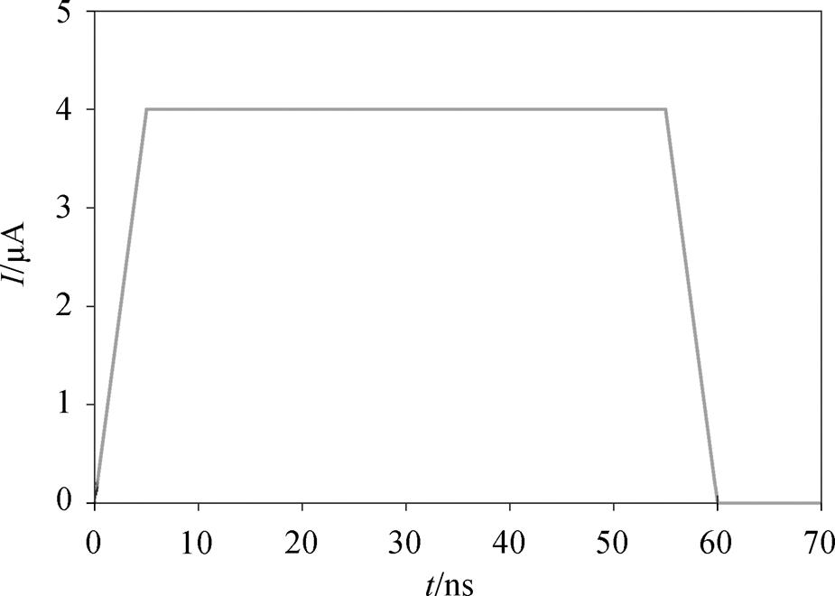 Pspice 仿真使用的电路原理图如图 3 所示。探测器等效为一个脉冲电流源与一个电容和一个电阻并联。在仿真中, 脉冲电流源的波形如图 4 所示, 参数设置如下: 脉冲上升时间 Tr=5μs, 脉冲保持时间 Pw=50μs, 脉冲下降时间 Tf=5μs。脉冲电流产生的电荷量等效于在 Si 探测器中沉积 5MeV 的能量所产生的电荷量。反馈电容 Cf=60fF, 反馈电阻 Rf= 1.2GΩ, 与 RENA3 前置放大器的参数一致。