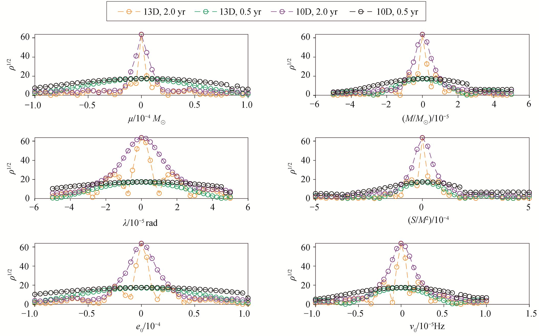 图 2 展示 13 维/10 维探测统计量(式(8))使用两年或半年数据时每个敏感参数的 1 维切面(以表 1 中LDC-1.2 真值为基准参数), 可以看出, 在数据长度相同的情况下, 10 维探测统计量对应的尖峰尖锐度比 13 维探测统计量(式(8))有一定程度的弱化, 在探测统计量维数相同的情况下, 半年数据对应的尖峰的尖锐度比两年数据有显著的弱化。