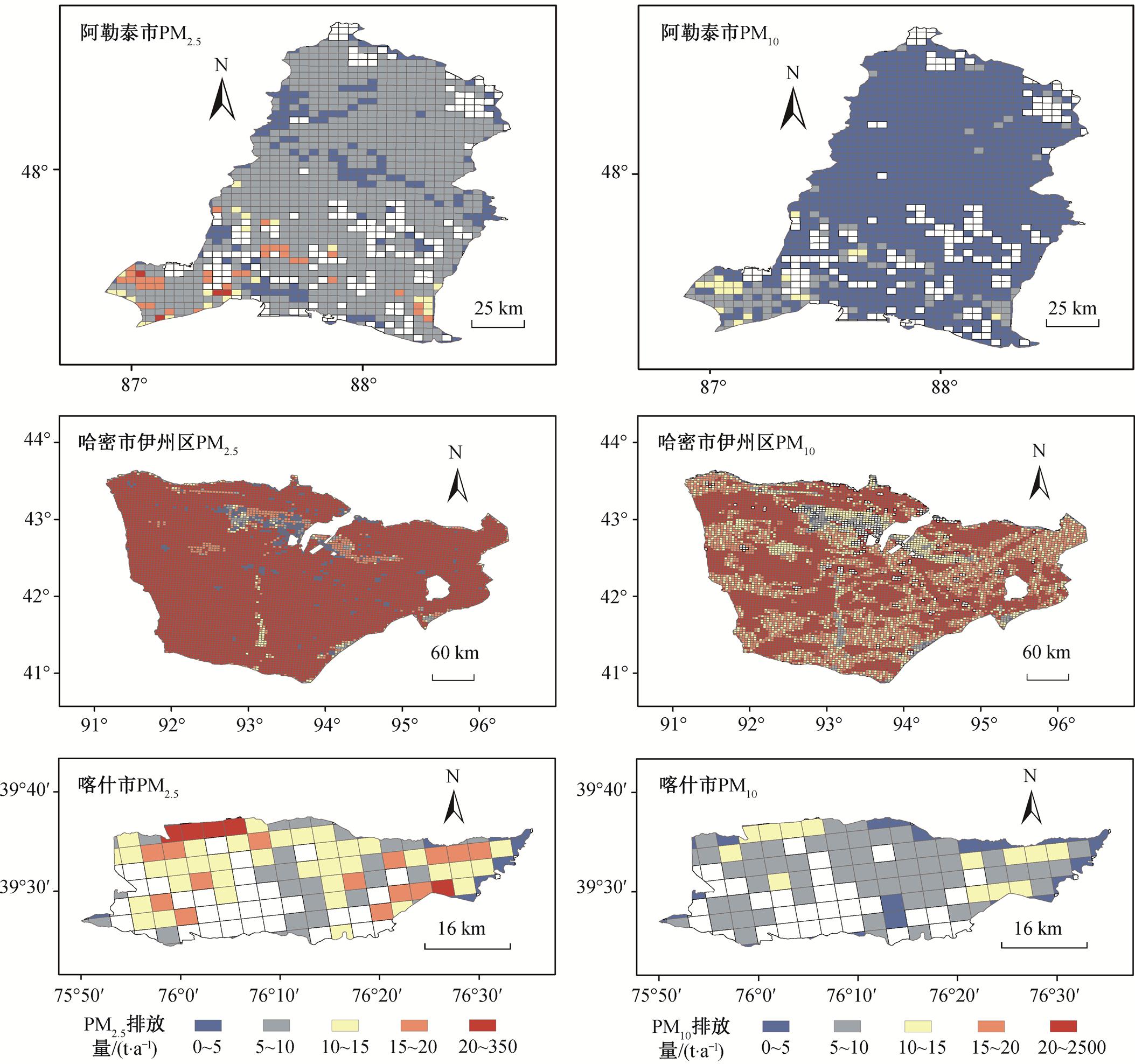 本文以新疆阿勒泰市、哈密市伊州区和喀什市为研究区域, 基于收集到的活动水平和排放因子数据, 采用排放因子法和 GIS 技术, 建立以 2021 年为基准年的 3km×3km 高分辨率土壤风蚀扬尘颗粒物排放清单, 得到如下主要结论。