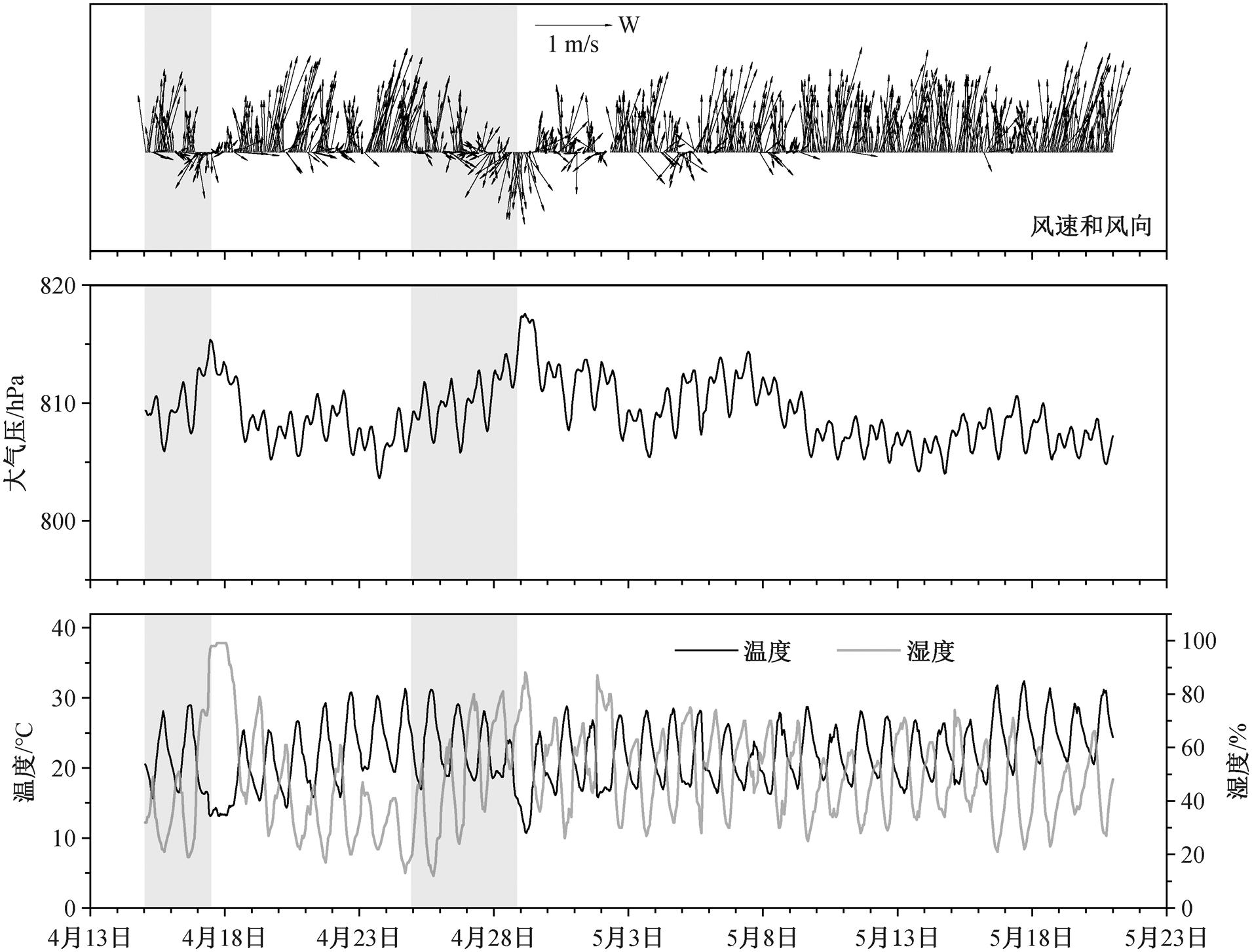 图 3 显示, 观测期间以西南风为主导, 平均风速为 0.8±0.5m/s, 与云南常年存在西南方向季风的情况吻合。温度范围为 10.8~32.4℃, 平均温度为21.95℃±4.32℃, 平均相对湿度为 48.1%±17.8%, 平均大气压强为 809.1±2.6hPa。观测期间为较干燥的春季, 处于中高温度、中低湿度[23]、低气压的状态, 此时控制当地的气流是干暖的大陆气团和昆明准静止锋, 使得降雨较少。观测期间经历 3 次降水过程: 4 月 17 日 9:00—21:00, 中到大雨; 4 月 29 日3:00—5:00, 小雨; 5 月 1 日 20:00, 小雨。