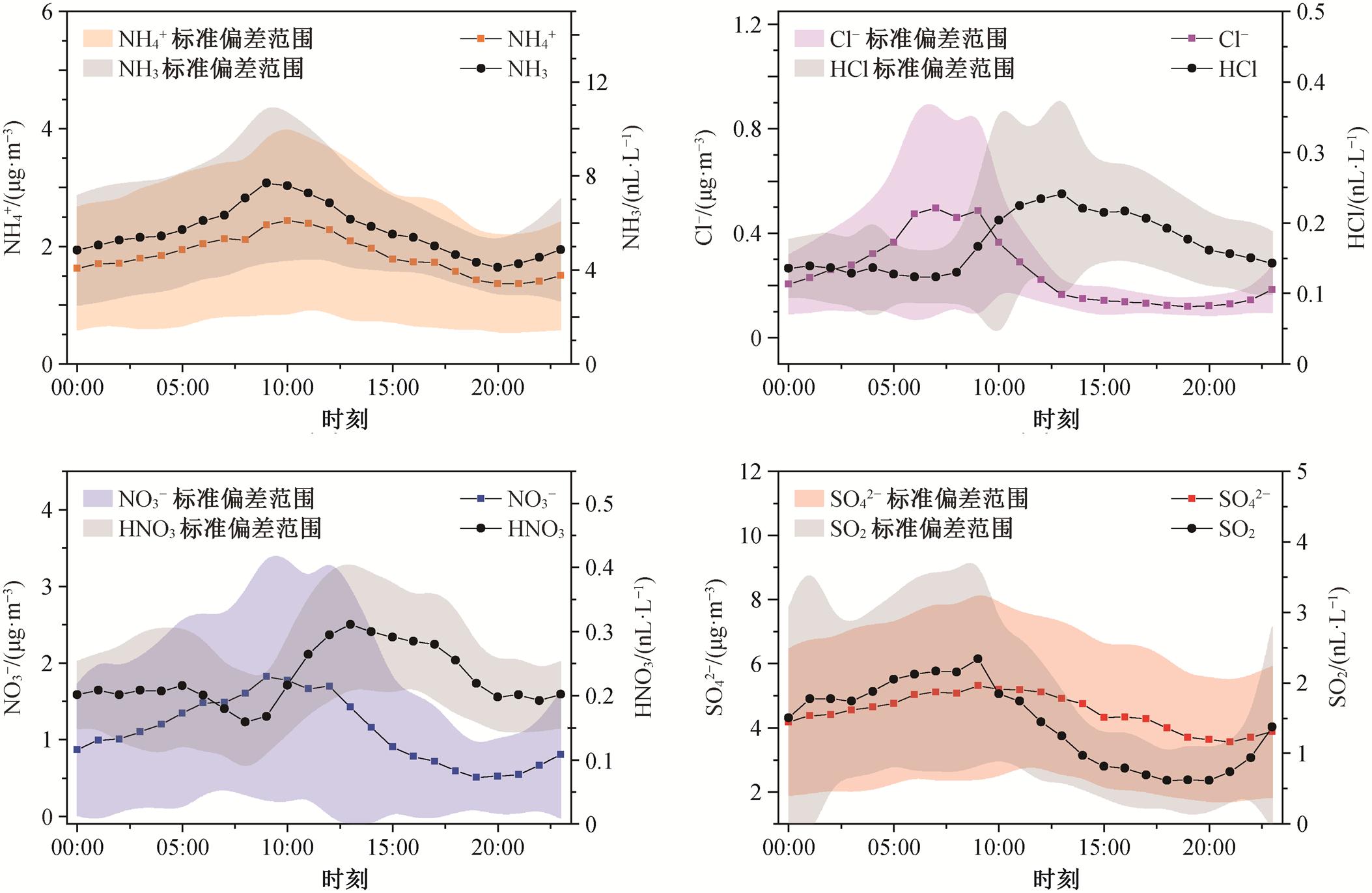 图 6 展示观测期间 NH4+, Cl−, NO3−和 SO42−及其前体气态污染物(NH3, HCl, HNO3 和 SO2)浓度的日变化规律。NH4+和 NH3浓度的日变化规律同步, 并与 NO3−和 Cl−浓度的日变化规律相似; Cl−与 HCl 浓度的日变化趋势相反, NO3−与 HNO3 浓度的日变化规律不同, 二者最高值出现在不同的时间; SO42−浓度的日变化幅度不如 SO2 明显。
