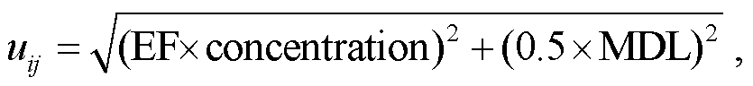 其中, uij 代表第 i 个样品中第 j 个物种浓度的不确定度; EF(error fraction)为根据使用者经验选取的误差系数, 本研究中取值为 10%; concentration 为第 i 个样品中第 j 个物种的浓度; MDL 为物种浓度的最低检出值。