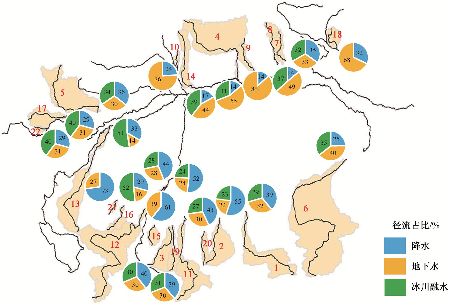空间分析结果表明, 有 11 个样本子流域中径流补给以降水为主导(即 f1 > f2, f1 > f3), 分布在塔里木流域南部, 包括尼雅河、克里雅河支流、努尔河和和田河等, 其径流中降水、地下水和冰川融水的占比为 39%~55%, 23%~30%和 22%~32%。有 7 个样本子流域的径流补给以地下水补给为主导(即 f2 > f1, f2 > f3), 主要分布于塔里木河流北部的绿洲区, 包括开都河、渭干河、阿克苏河(托什干河)支流、库车河以及台兰河等, 其径流中降水、地下水和冰川融水占比为 14%~32%, 44%~76%和 0%~39%。剩余 4个以冰川融水为径流主要补给来源的子流域则分布于西南部, 包括提孜那甫河和木孜苏河等, 其径流补给来源组分占比为 29%~33%, 14%~31%和 40%~ 53%。