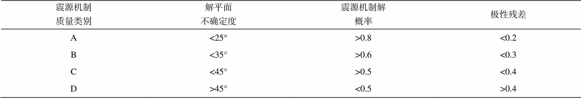 震源机制质量类别解平面不确定度震源机制解概率极性残差 A<25°>0.8<0.2 B<35°>0.6<0.3 C<45°>0.5<0.4 D>45°<0.5>0.4
