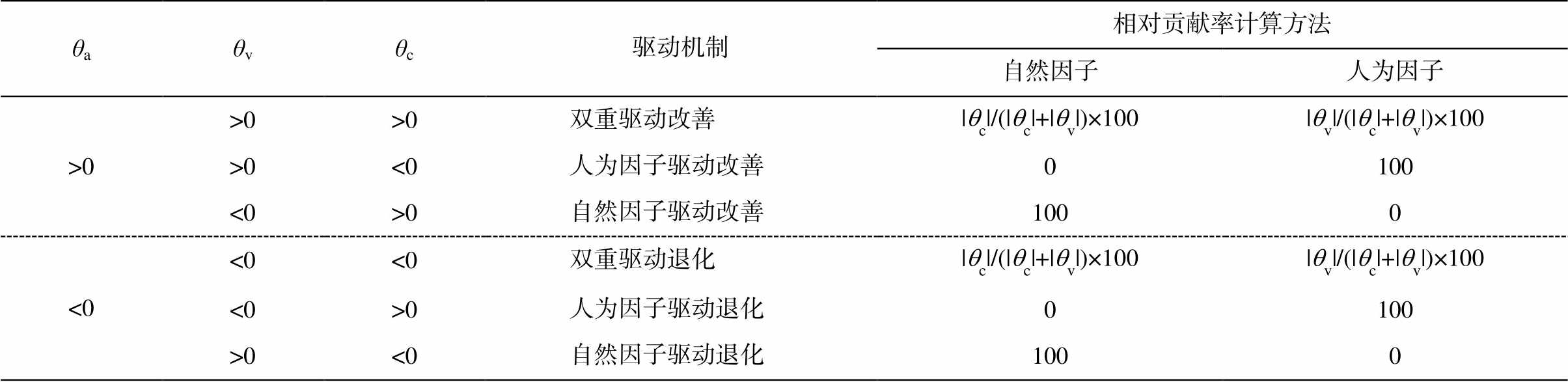 θaθvθc驱动机制相对贡献率计算方法自然因子人为因子 >0>0>0双重驱动改善|qc|/(|qc|+|qv|)×100|qv|/(|qc|+|qv|)×100 >0<0人为因子驱动改善0100 <0>0自然因子驱动改善1000 <0<0<0双重驱动退化|qc|/(|qc|+|qv|)×100|qv|/(|qc|+|qv|)×100 <0>0人为因子驱动退化0100 >0<0自然因子驱动退化1000