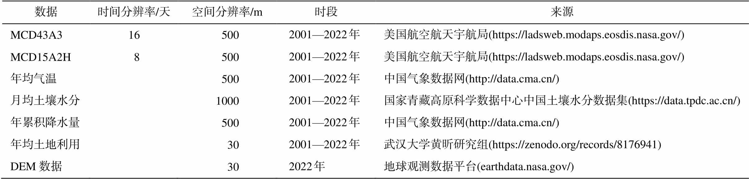 数据时间分辨率/天空间分辨率/m时段来源 MCD43A316 5002001—2022 年美国航空航天宇航局(https://ladsweb.modaps.eosdis.nasa.gov/) MCD15A2H 8 5002001—2022 年美国航空航天宇航局(https://ladsweb.modaps.eosdis.nasa.gov/) 年均气温 5002001—2022 年中国气象数据网(http://data.cma.cn/) 月均土壤水分10002001—2022 年国家青藏高原科学数据中心中国土壤水分数据集(https://data.tpdc.ac.cn/) 年累积降水量 5002001—2022 年中国气象数据网(http://data.cma.cn/) 年均土地利用 302001—2022 年武汉大学黄昕研究组(https://zenodo.org/records/8176941) DEM数据 302022 年地球观测数据平台(earthdata.nasa.gov/)