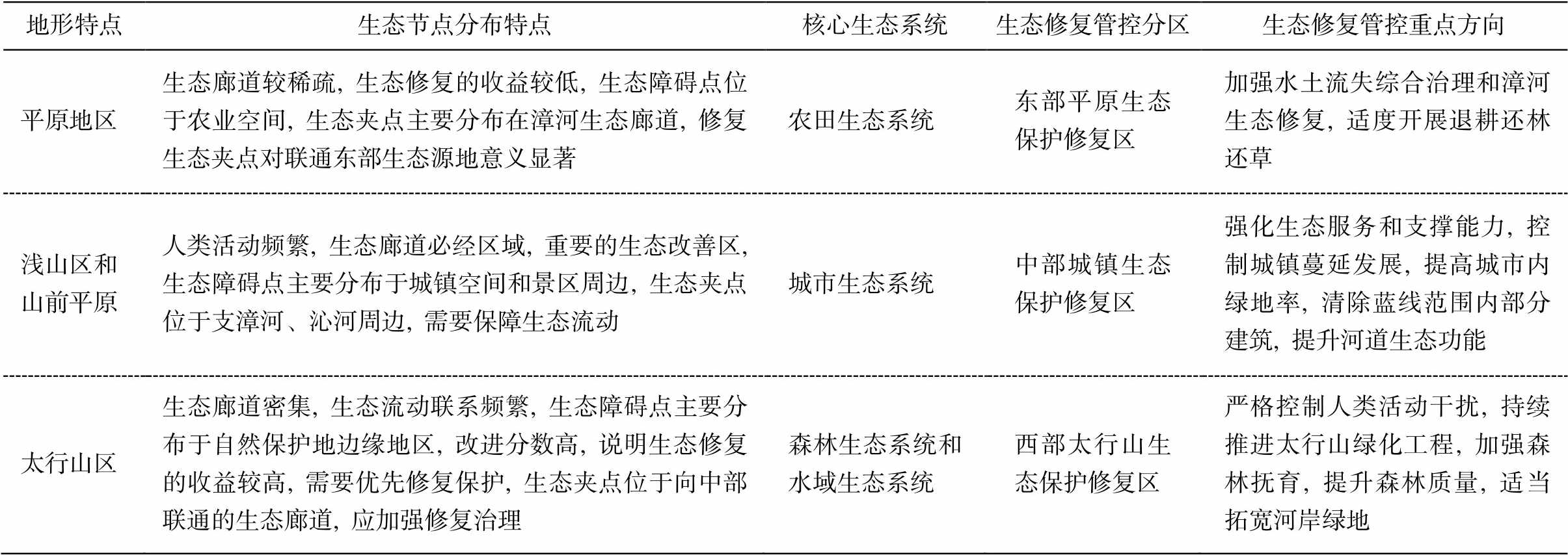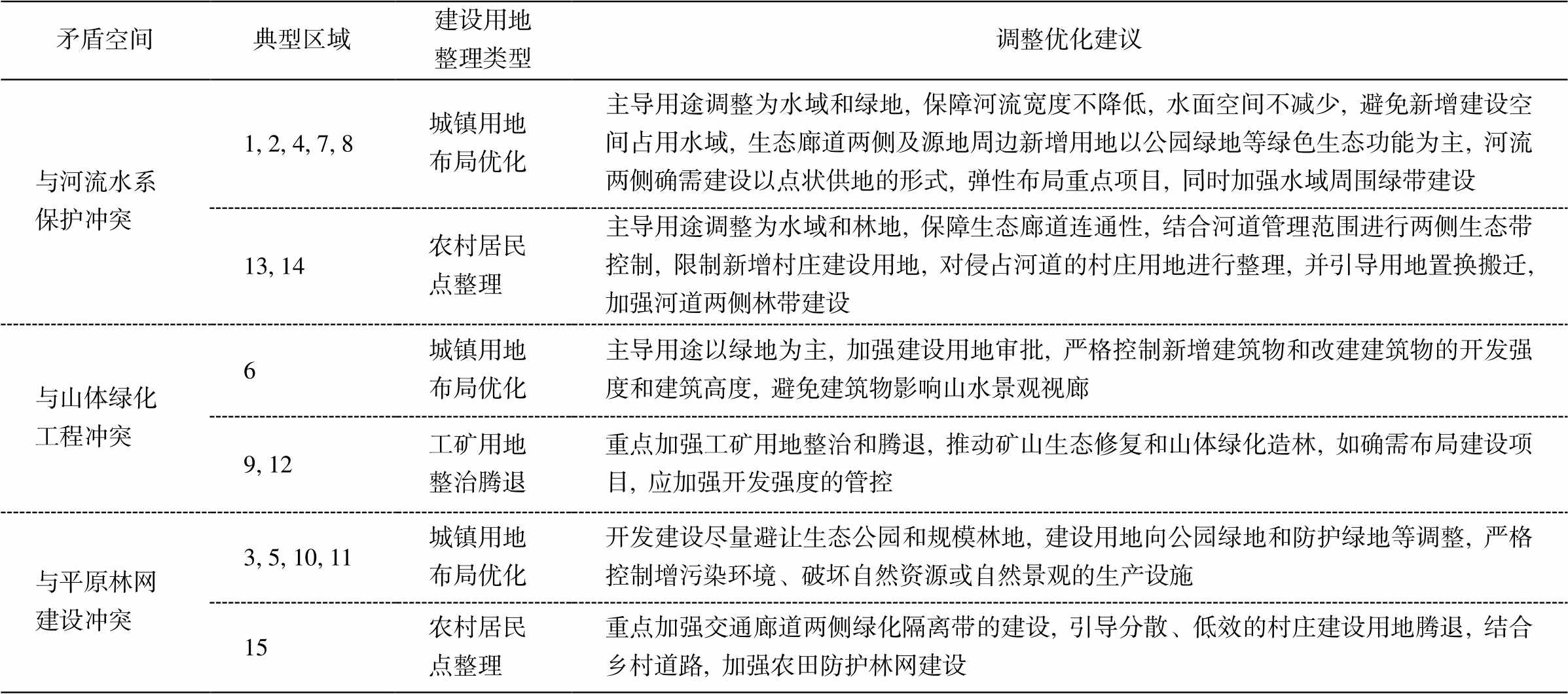 本文从 3 个方面推进规划应用的拓展: 1)将廊道线性要素转化为宽度指标, 通过情景模拟, 确定不同区域的最佳宽度方案, 据此提出廊道管控要求; 2)通过识别生态夹点和生态障碍点, 并叠加生态系统特征, 划分不同类型的修复区; 3)叠加村庄、工矿、城镇、交通等建设用地, 判别矛盾冲突空间与潜在的整理空间, 推动重点区域建设用地的整治。