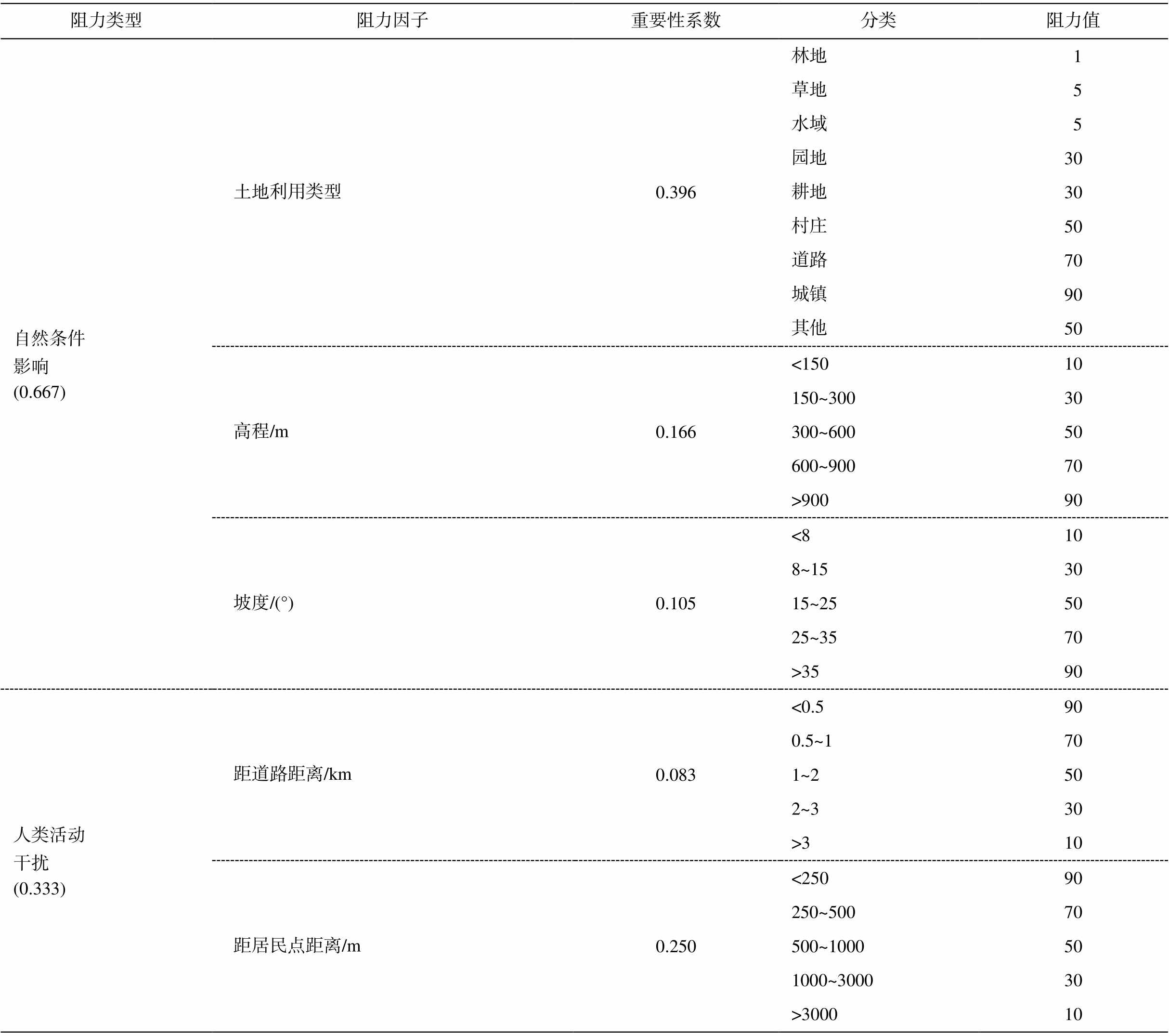阻力类型阻力因子重要性系数分类阻力值 自然条件影响(0.667)土地利用类型0.396林地 1 草地 5 水域 5 园地30 耕地30 村庄50 道路70 城镇90 其他50 高程/m0.166<15010 150~30030 300~60050 600~90070 >90090 坡度/(°)0.105<810 8~1530 15~2550 25~3570 >3590 人类活动干扰(0.333)距道路距离/km0.083<0.590 0.5~170 1~250 2~330 >310 距居民点距离/m0.250<25090 250~50070 500~100050 1000~300030 >300010