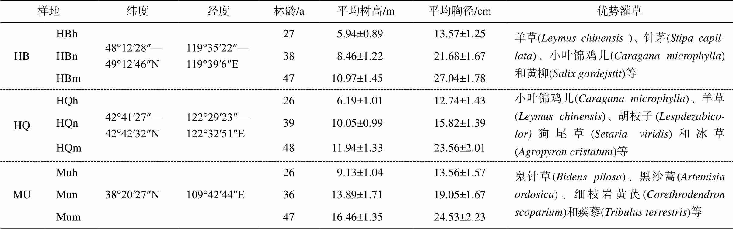 样地纬度经度林龄/a平均树高/m平均胸径/cm优势灌草 HBHBh48°12′28″—49°12′46″N119°35′22″—119°39′6″E275.94±0.8913.57±1.25羊草(Leymuschinensis )、针茅(Stipacapil-lata)、小叶锦鸡儿(Caraganamicrophylla)和黄柳(Salixgordejstit)等 HBn388.46±1.2221.68±1.67 HBm4710.97±1.4527.04±1.78 HQHQh42°41′27″—42°42′32″N122°29′23″—122°32′51″E266.19±1.0112.74±1.43小叶锦鸡儿(Caraganamicrophylla)、羊草(Leymuschinensis)、胡枝子(Lespdezabico-lor)狗尾草(Setariaviridis)和冰草(Agropyroncristatum)等 HQn3910.05±0.9915.82±1.39 HQm4811.94±1.3323.56±2.01 MUMuh38°20′27″N109°42′44″E269.13±1.0413.56±1.57鬼针草(Bidenspilosa)、黑沙蒿(Artemisia ordosica)、细枝岩黄芪(Corethrodendronscoparium)和蒺藜(Tribulusterrestris)等 Mun3613.89±1.7119.05±1.67 Mum4716.46±1.3524.53±2.23