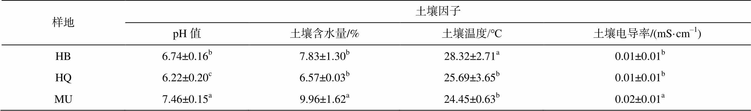 样地土壤因子 pH值土壤含水量/%土壤温度/℃土壤电导率/(mS·cm–1) HB6.74±0.16b7.83±1.30b28.32±2.71a0.01±0.01b HQ6.22±0.20c6.57±0.03b25.69±3.65b0.01±0.01b MU7.46±0.15a9.96±1.62a24.45±0.63b0.02±0.01a