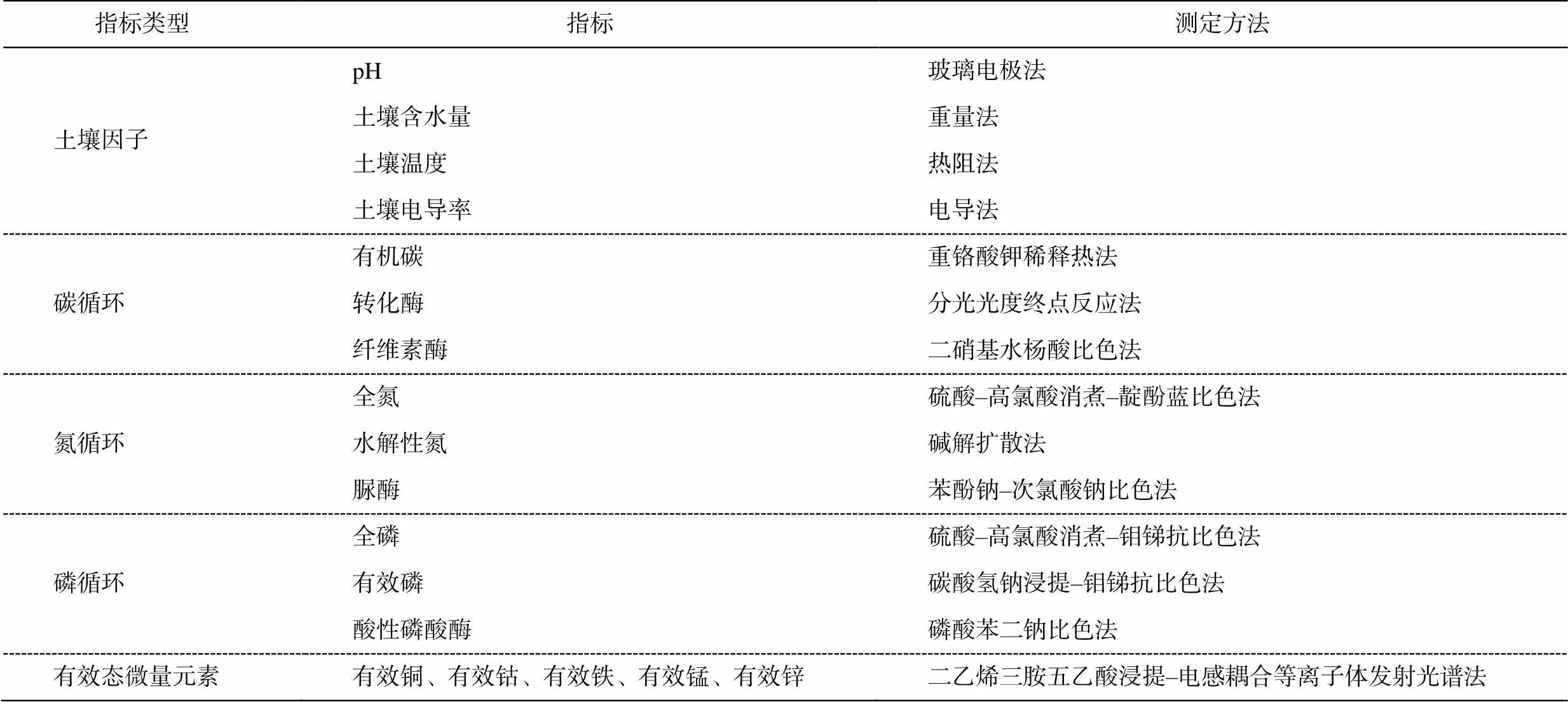 指标类型 指标测定方法 土壤因子pH玻璃电极法 土壤含水量重量法 土壤温度热阻法 土壤电导率电导法 碳循环有机碳重铬酸钾稀释热法 转化酶分光光度终点反应法 纤维素酶二硝基水杨酸比色法 氮循环全氮硫酸–高氯酸消煮–靛酚蓝比色法 水解性氮碱解扩散法 脲酶苯酚钠–次氯酸钠比色法 磷循环全磷硫酸–高氯酸消煮–钼锑抗比色法 有效磷碳酸氢钠浸提–钼锑抗比色法 酸性磷酸酶磷酸苯二钠比色法 有效态微量元素有效铜、有效钴、有效铁、有效锰、有效锌二乙烯三胺五乙酸浸提–电感耦合等离子体发射光谱法