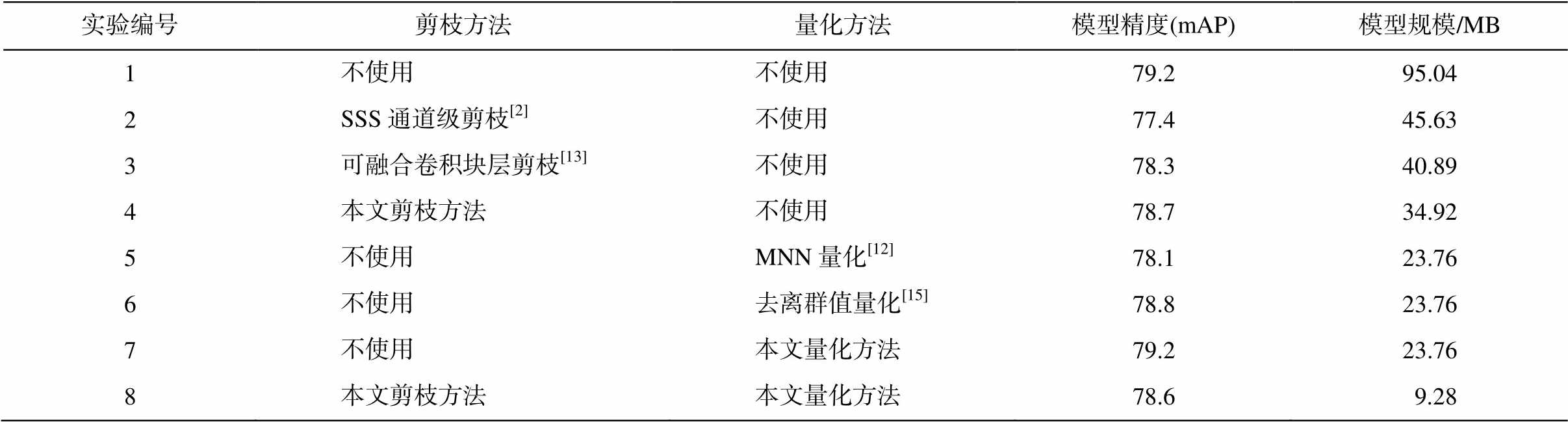 实验编号剪枝方法量化方法模型精度(mAP)模型规模/MB 1不使用不使用79.295.04 2SSS通道级剪枝[2]不使用77.445.63 3可融合卷积块层剪枝[13]不使用78.340.89 4本文剪枝方法不使用78.734.92 5不使用MNN量化[12]78.123.76 6不使用去离群值量化[15]78.823.76 7不使用本文量化方法79.223.76 8本文剪枝方法本文量化方法78.6 9.28