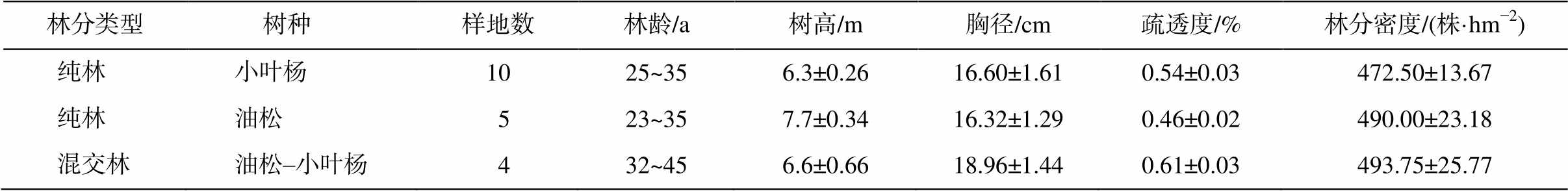 林分类型树种 样地数林龄/a树高/m胸径/cm疏透度/%林分密度/(株·hm−2) 纯林小叶杨1025~356.3±0.2616.60±1.610.54±0.03472.50±13.67 纯林油松 523~357.7±0.3416.32±1.290.46±0.02490.00±23.18 混交林油松–小叶杨 432~456.6±0.6618.96±1.440.61±0.03493.75±25.77