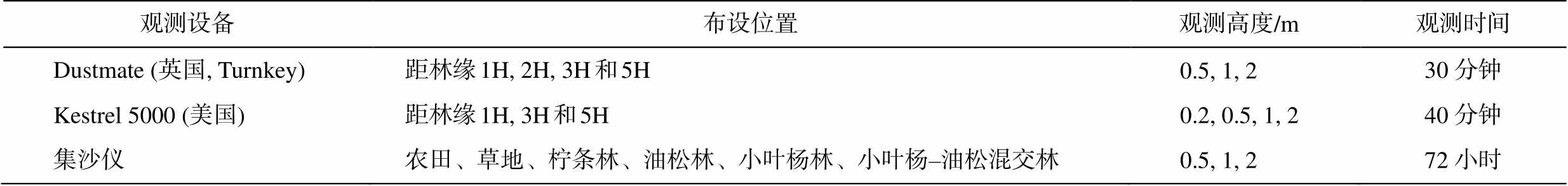 观测设备布设位置观测高度/m 观测时间 Dustmate (英国, Turnkey)距林缘 1H, 2H, 3H 和 5H0.5, 1, 230分钟 Kestrel 5000 (美国)距林缘 1H, 3H 和 5H0.2, 0.5, 1, 240分钟 集沙仪农田、草地、柠条林、油松林、小叶杨林、小叶杨–油松混交林0.5, 1, 272小时