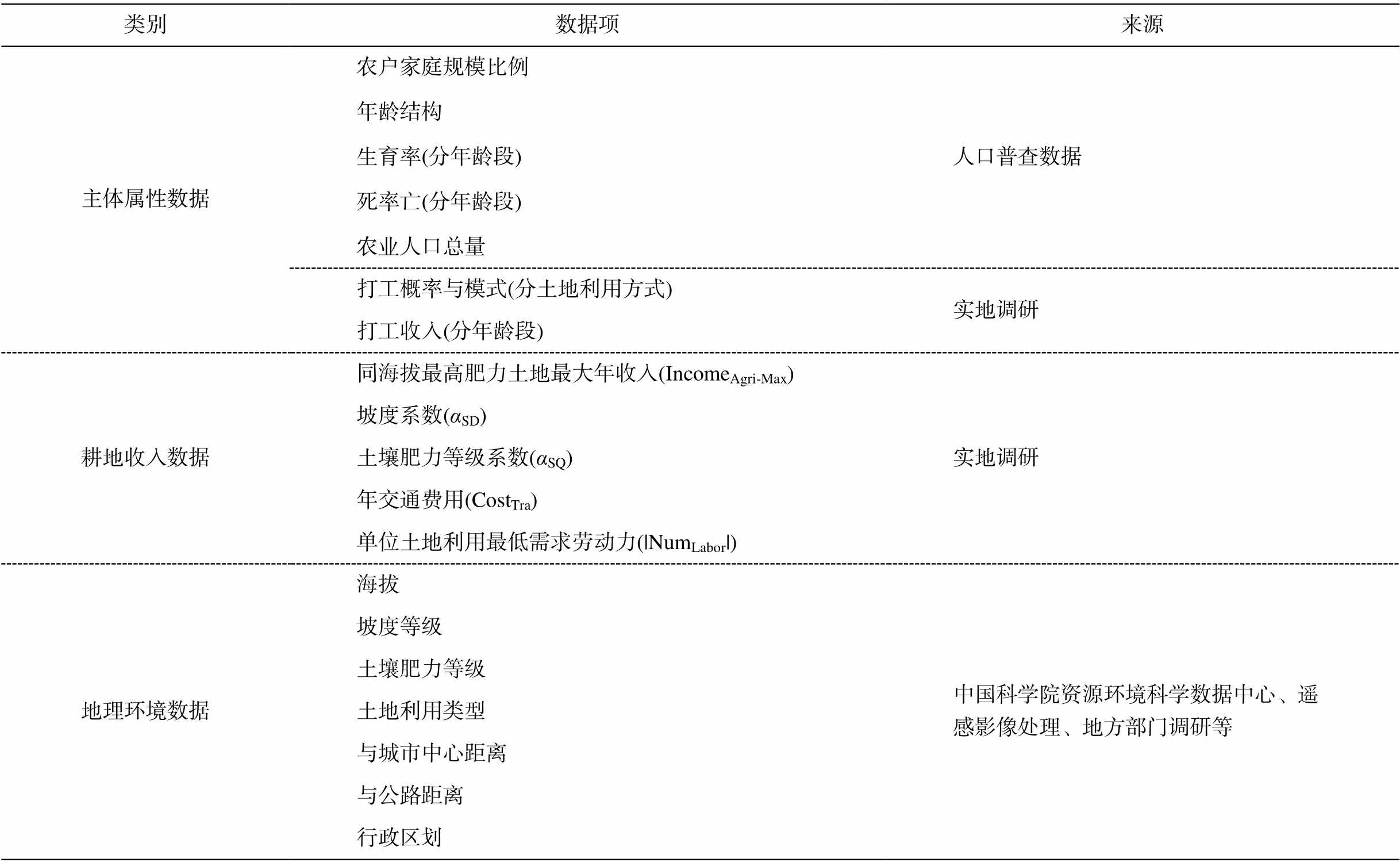 本模型的数据主要包括主体属性数据、土地收入数据和地理环境数据。主体属性数据通过实地调研和人口普查数据等获取, 土地收入数据通过实地调研获取, 地理环境数据通过遥感影像处理、中国科学院资源环境科学数据中心(http://www.resdc.cn/)下载以及地方部门调研等方式获取(表 1)。