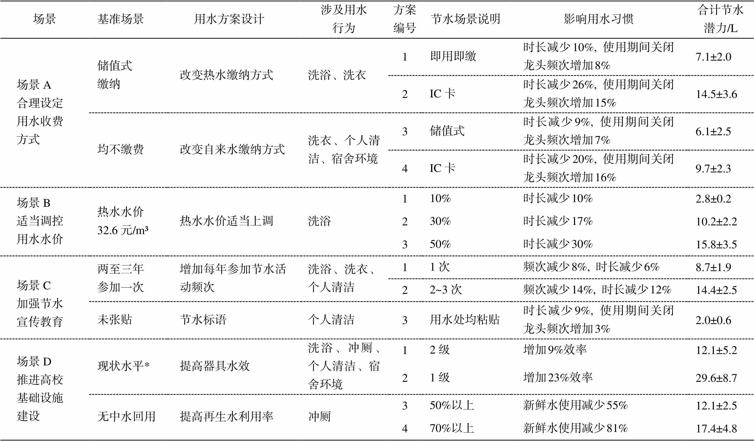 场景基准场景用水方案设计 涉及用水行为方案编号节水场景说明影响用水习惯合计节水潜力/L 场景A合理设定用水收费方式储值式缴纳改变热水缴纳方式洗浴、洗衣1即用即缴时长减少 10%, 使用期间关闭龙头频次增加 8%7.1±2.0 2IC卡时长减少 26%, 使用期间关闭龙头频次增加 15%14.5±3.6 均不缴费改变自来水缴纳方式洗衣、个人清洁、宿舍环境3储值式时长减少 9%, 使用期间关闭龙头频次增加 7%6.1±2.5 4IC卡时长减少 20%, 使用期间关闭龙头频次增加 16%9.7±2.3 场景B适当调控用水水价热水水价32.6元/m³热水水价适当上调洗浴110%时长减少 10%2.8±0.2 230%时长减少 17%10.2±2.2 350%时长减少 30%15.8±3.5 场景C加强节水宣传教育两至三年参加一次增加每年参加节水活动频次洗浴、洗衣、个人清洁11次频次减少 8%, 时长减少 6%8.7±1.9 22~3次频次减少 14%, 时长减少 12%14.4±2.5 未张贴节水标语个人清洁3用水处均粘贴时长减少 9%, 使用期间关闭龙头频次增加 3%2.0±0.6 场景D推进高校基础设施建设现状水平*提高器具水效洗浴、冲厕、个人清洁、宿舍环境12级增加 9%效率12.1±5.2 21级增加 23%效率29.6±8.7 无中水回用提高再生水利用率冲厕350%以上新鲜水使用减少 55%12.1±2.5 470%以上新鲜水使用减少 81%17.4±4.8
