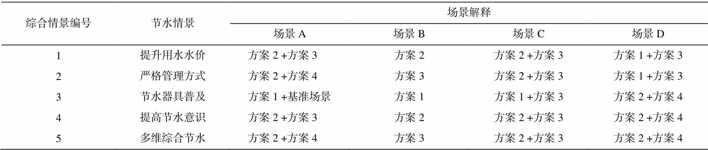综合情景编号节水情景场景解释 场景A场景B场景C场景D 1提升用水水价方案2 +方案3方案2方案2 +方案3方案1 +方案3 2严格管理方式方案2 +方案4方案3方案2 +方案3方案1 +方案3 3节水器具普及方案1 +基准场景方案1方案1 +方案3方案2 +方案4 4提高节水意识方案2 +方案3方案2方案2 +方案3方案2 +方案4 5多维综合节水方案2 +方案4方案3方案2 +方案3方案2 +方案4