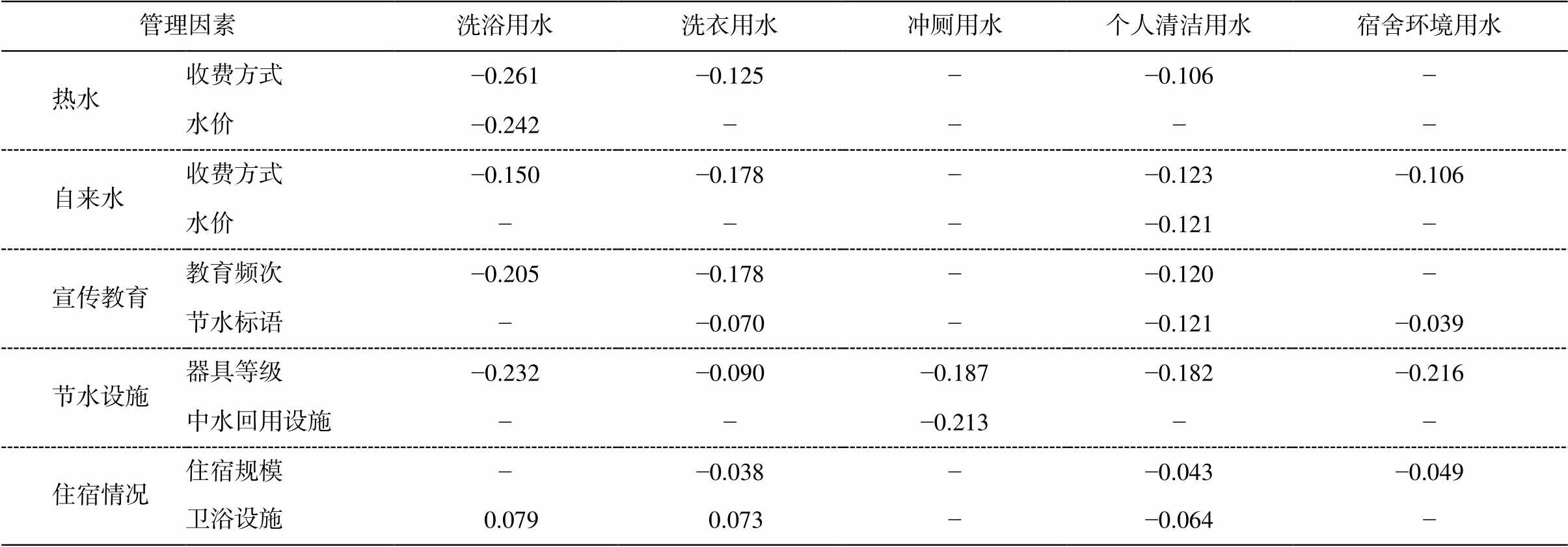 管理因素 洗浴用水洗衣用水冲厕用水个人清洁用水宿舍环境用水 热水收费方式−0.261−0.125−−0.106− 水价−0.242−−−− 自来水收费方式−0.150−0.178−−0.123−0.106 水价−−−−0.121− 宣传教育教育频次−0.205−0.178−−0.120− 节水标语−−0.070−−0.121−0.039 节水设施器具等级−0.232−0.090−0.187−0.182−0.216 中水回用设施−−−0.213−− 住宿情况住宿规模−−0.038−−0.043−0.049 卫浴设施 0.079 0.073−−0.064−